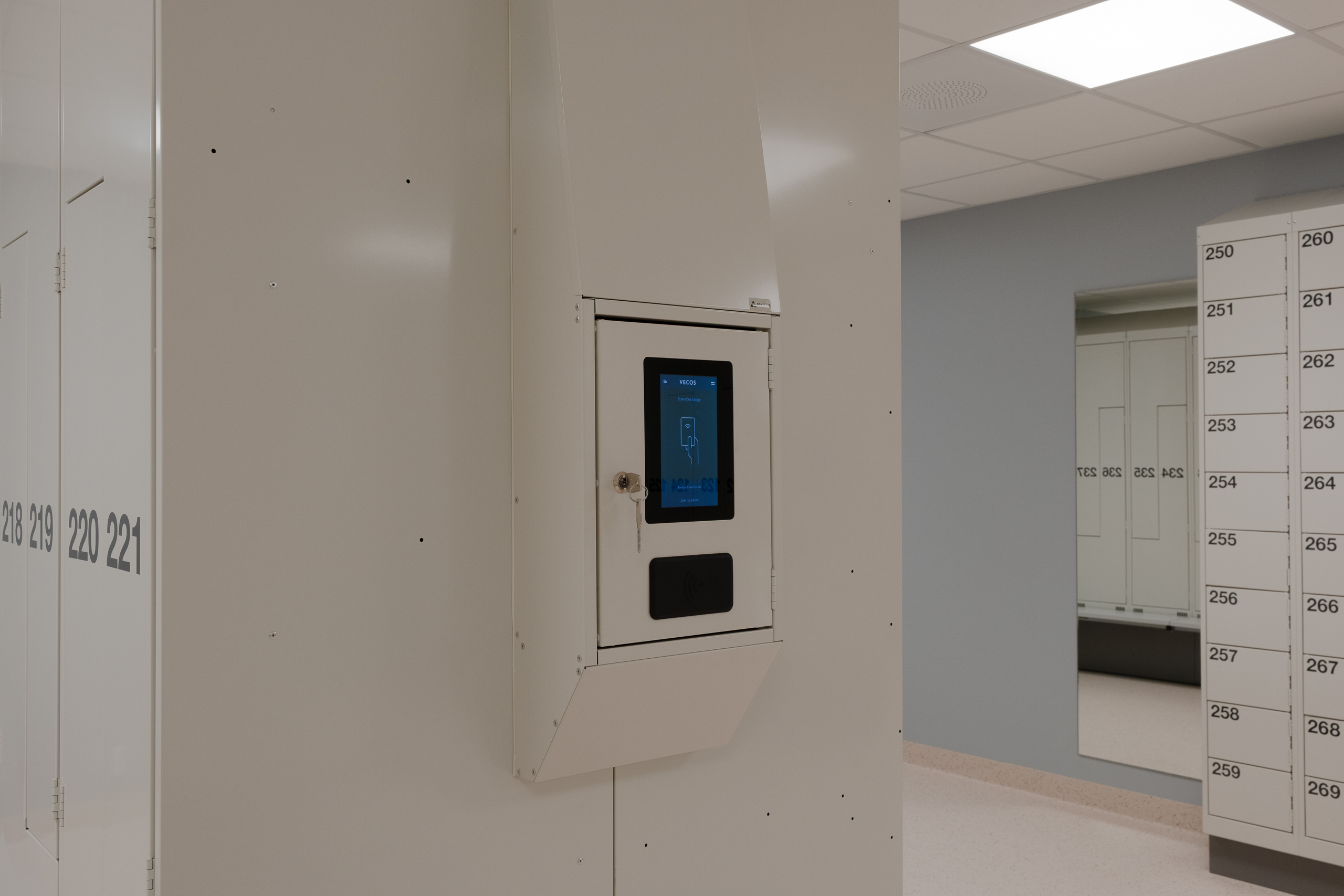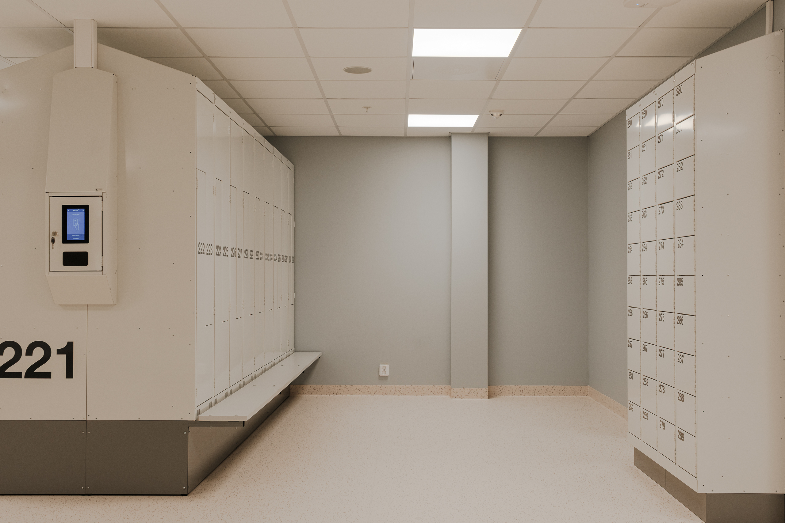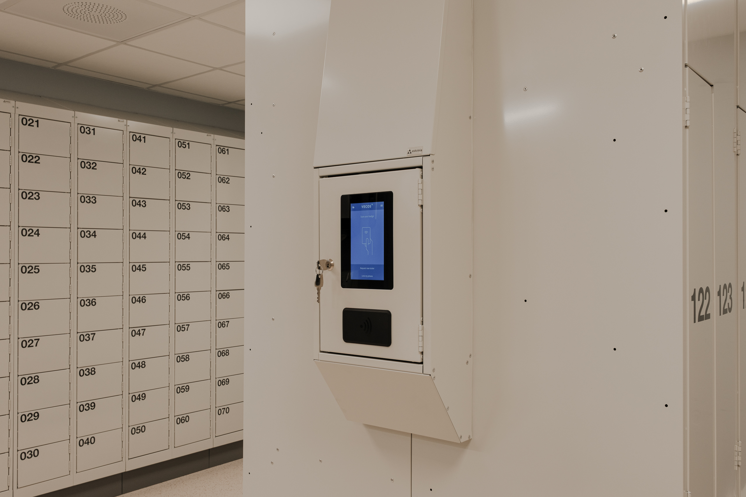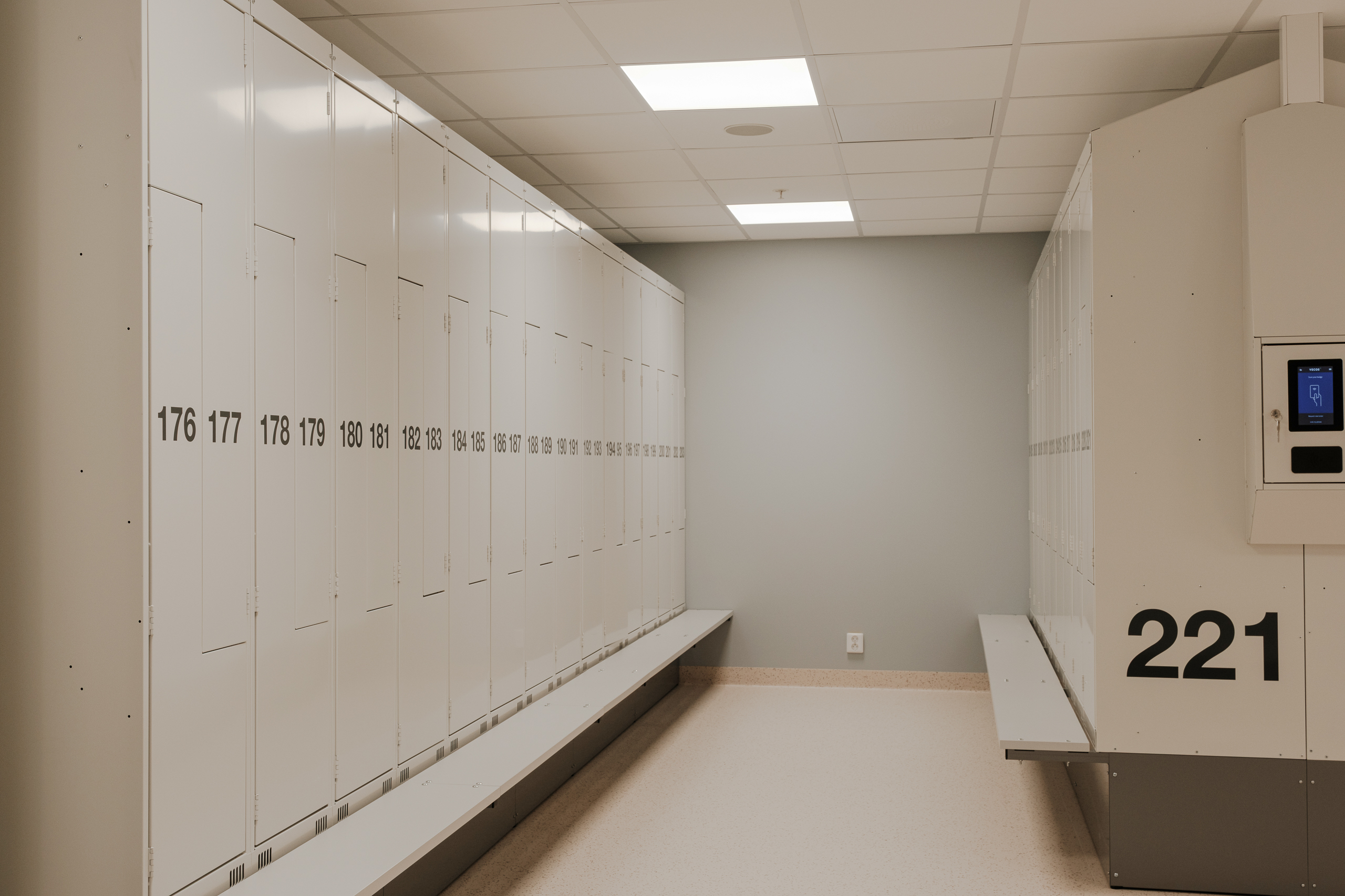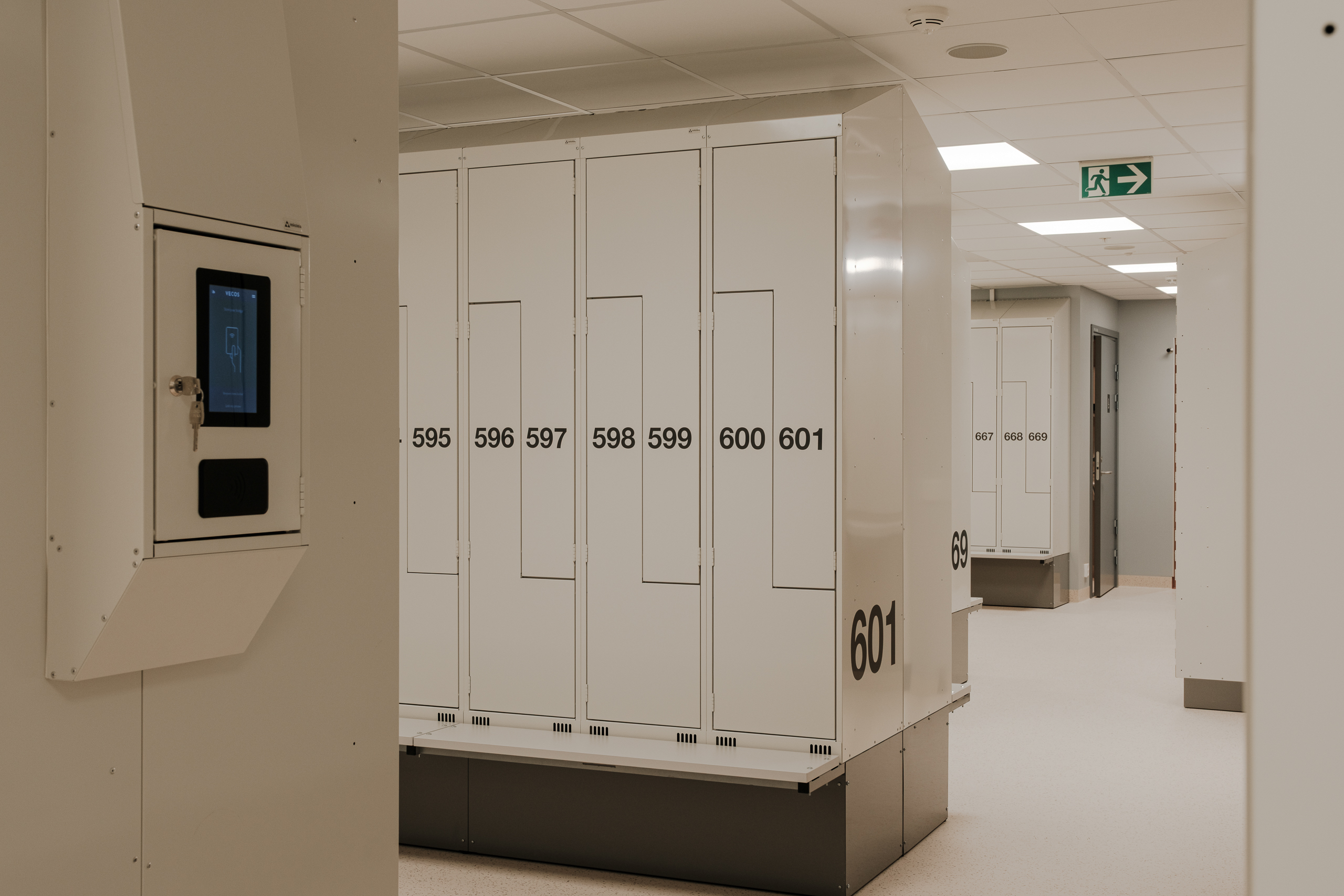Ved Akershus universitetssykehus (Ahus) har Eskoleia levert en komplett og fremtidsrettet garderobeløsning med Z-skap garderobeskap, skoskap og dynamisk låsesystem fra Vecos med spesialutviklede terminaler.