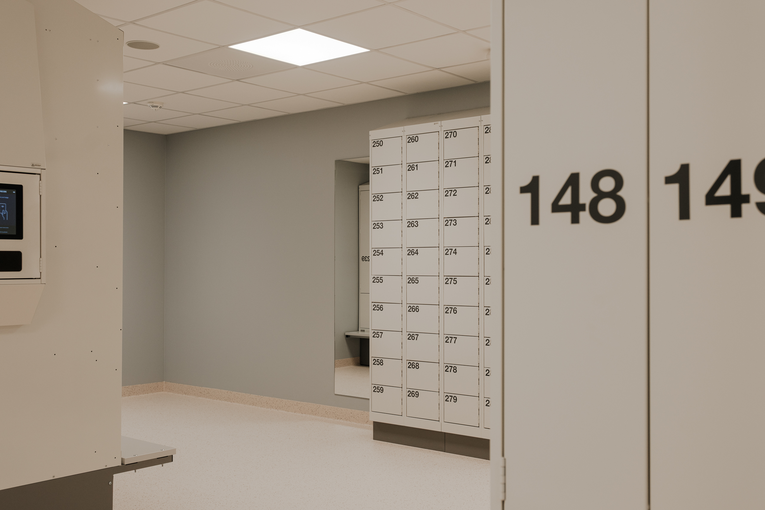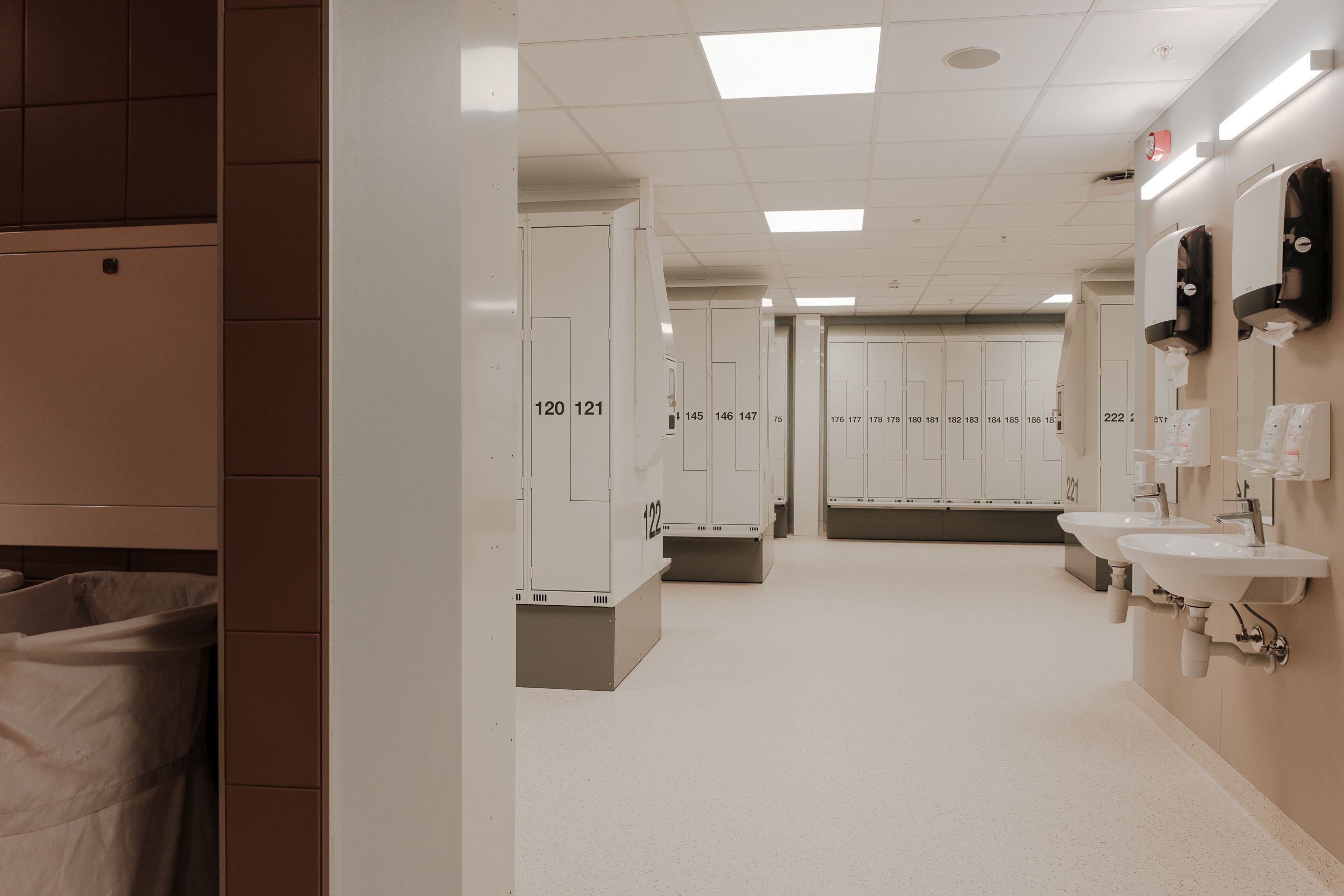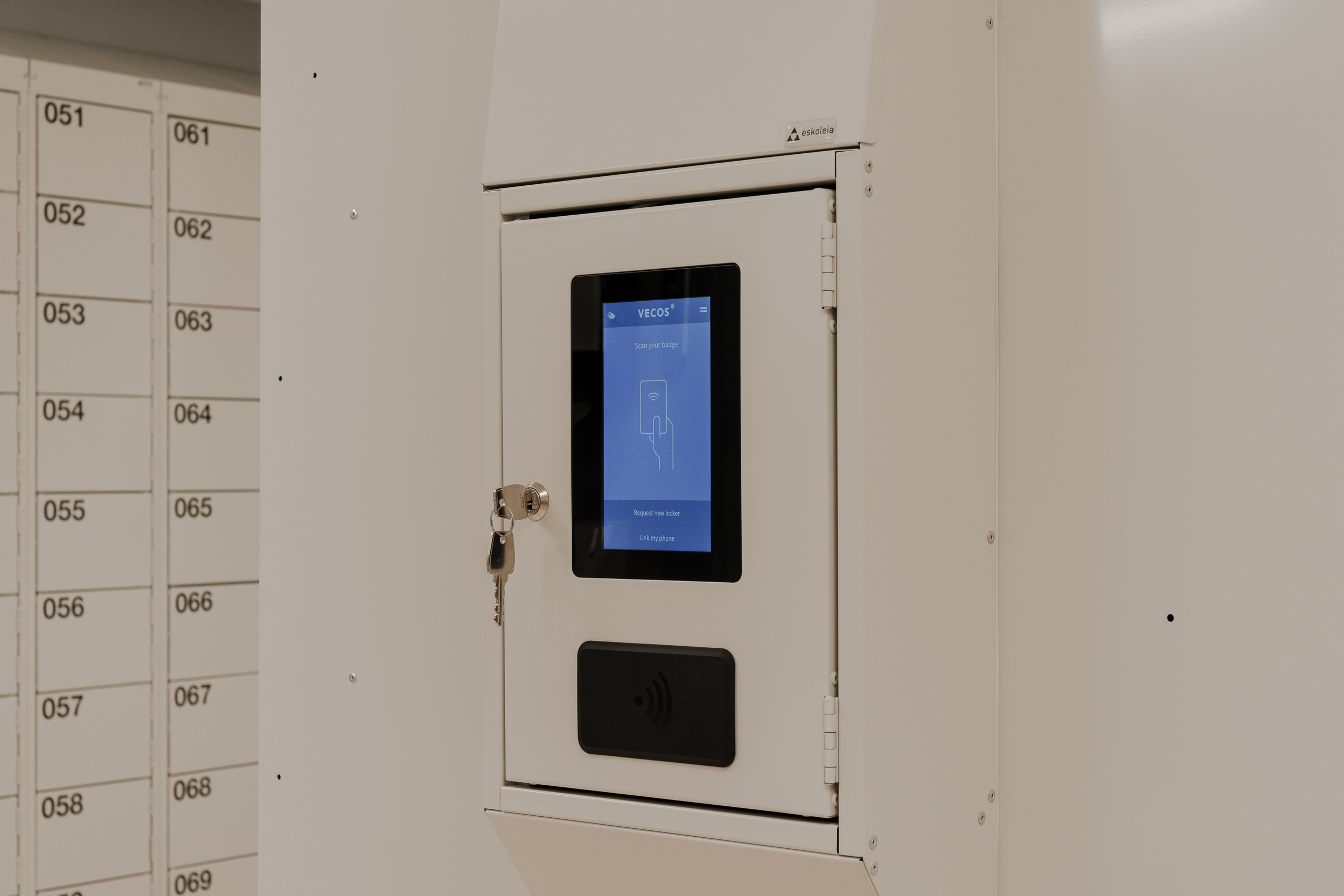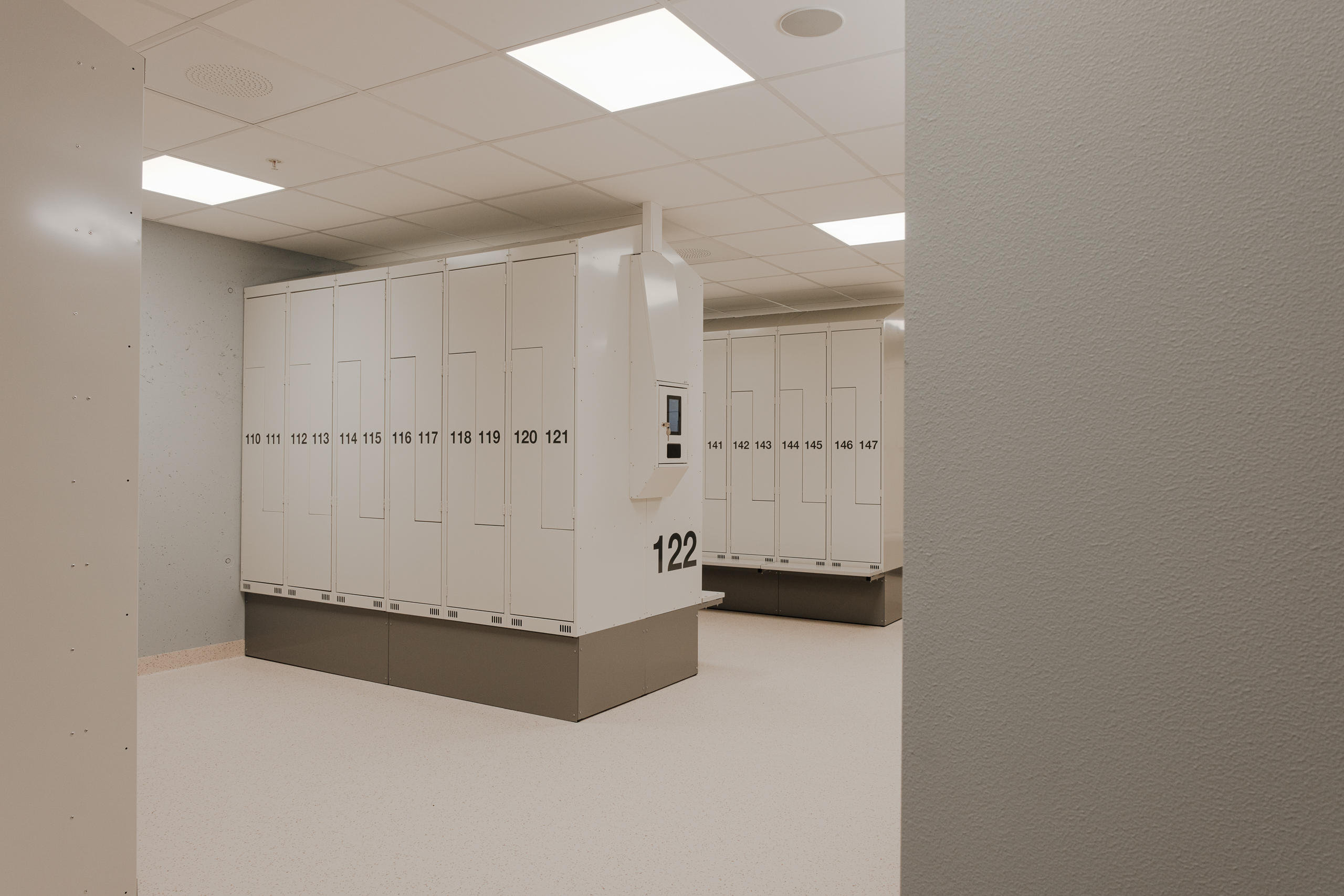 Ved Akershus universitetssykehus (Ahus) har Eskoleia levert en komplett og fremtidsrettet garderobeløsning med Z-skap garderobeskap, skoskap og dynamisk låsesystem fra Vecos med spesialutviklede terminaler.