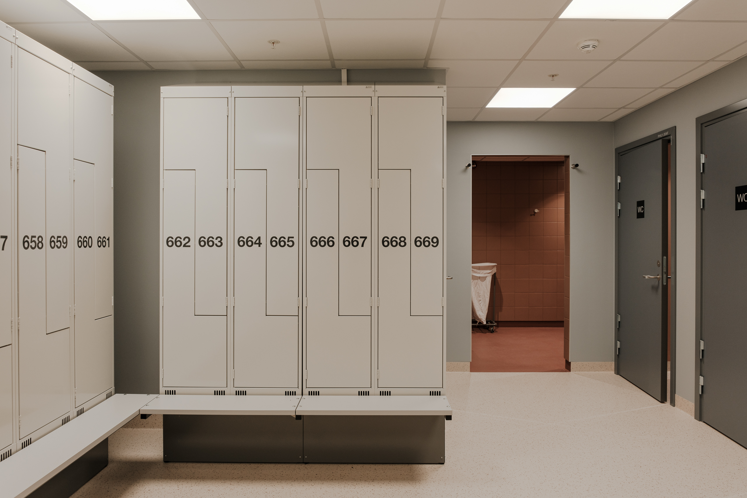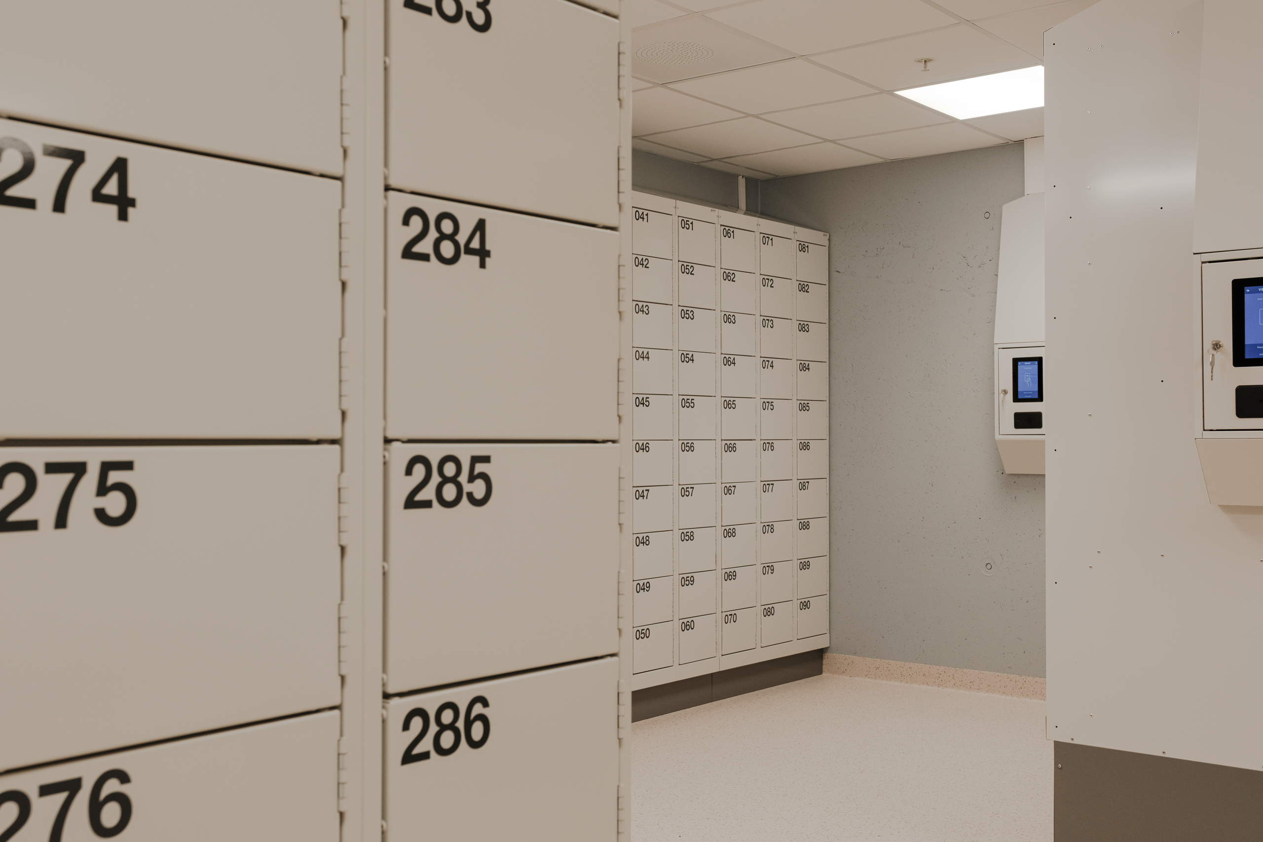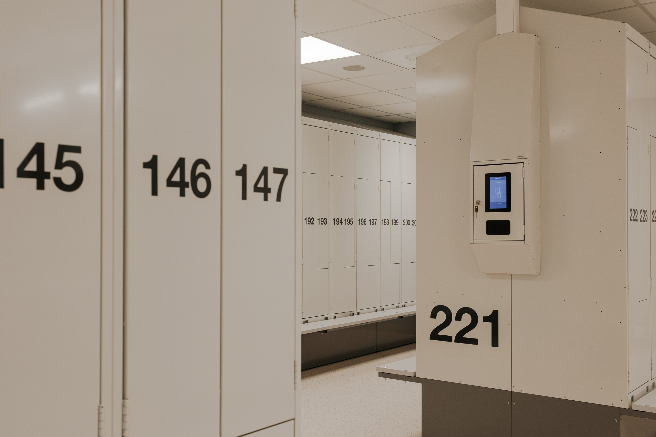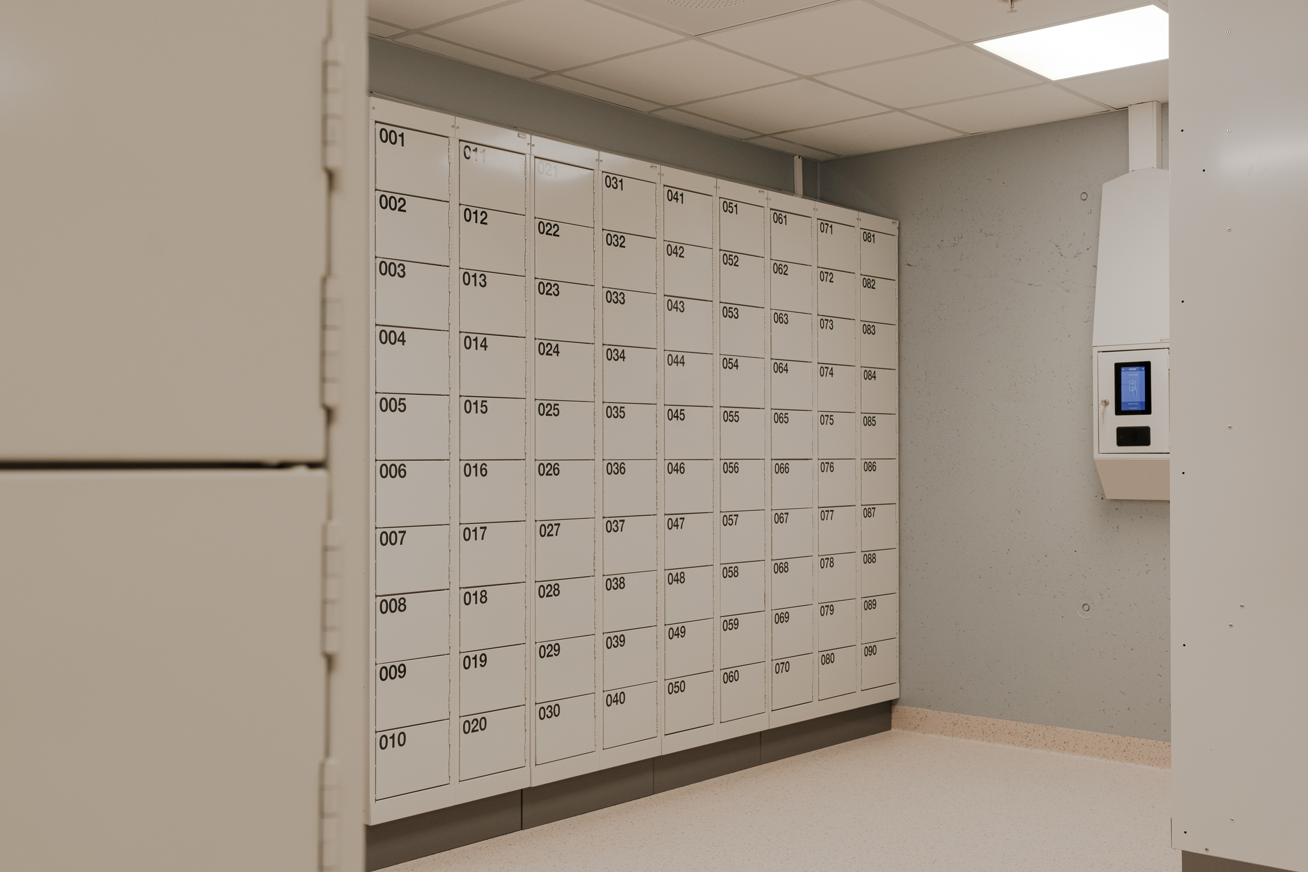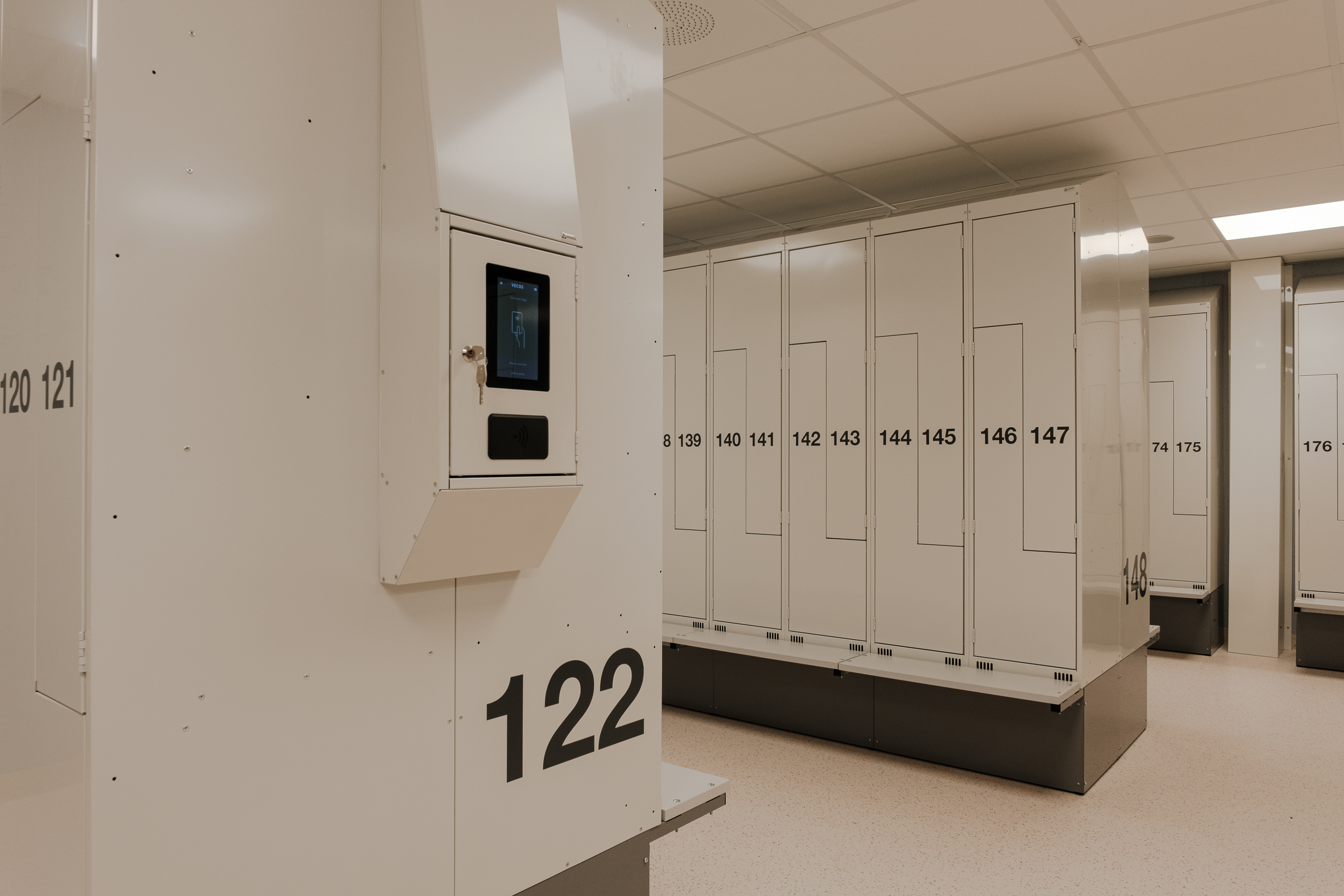 Ved Akershus universitetssykehus (Ahus) har Eskoleia levert en komplett og fremtidsrettet garderobeløsning med Z-skap garderobeskap, skoskap og dynamisk låsesystem fra Vecos med spesialutviklede terminaler.